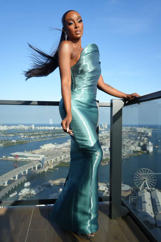 En la gala celebrada en el Kaseya Center en Miami, la artista dominicana apostó por un vestido de silueta columna en tono verde jade con matices aqua, confeccionado en una tela satinada de acabado técnico y microtextura visible que capturaba la luz con un efecto casi líquido.